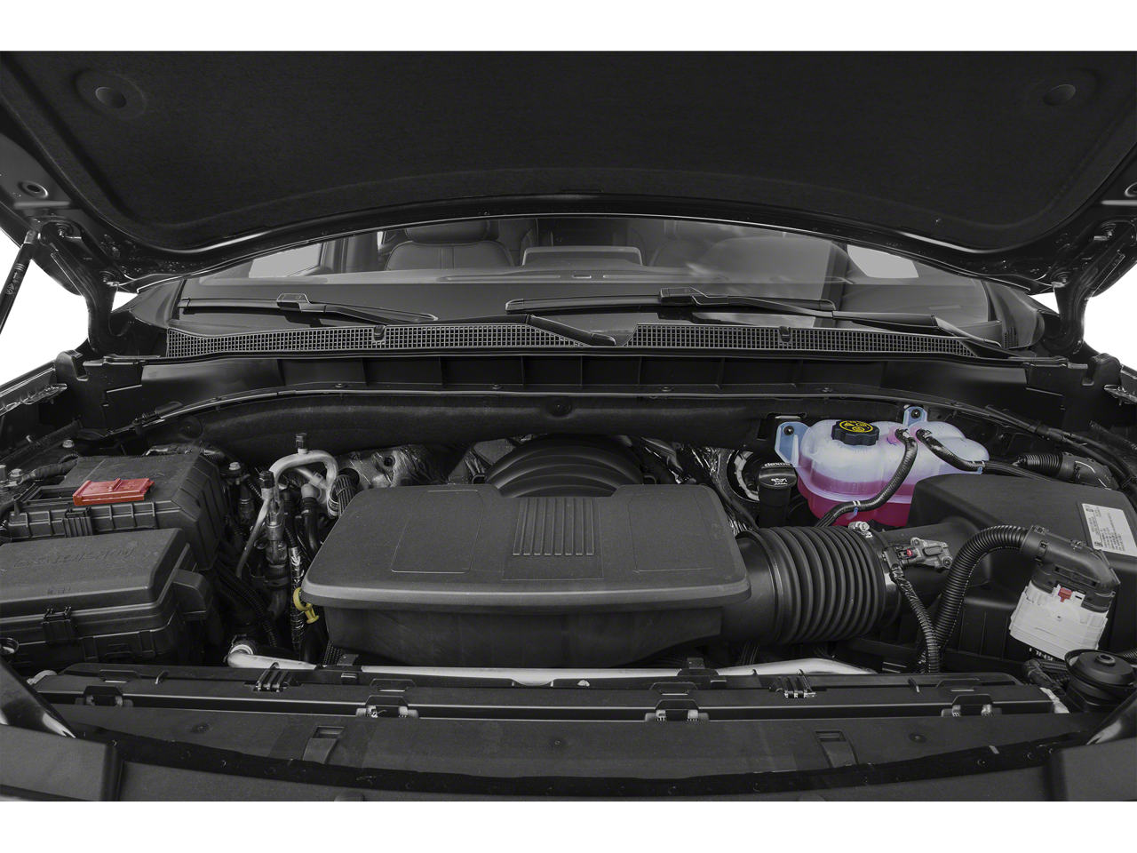 with Chrome inserts, LPO wheels will come with 4 steel 22" wheels from the factory with alignment specs set to 22" LPO wheel selected (dealer-installed) (Includes factory-installed wheel locks and not (SFE) wheel locks, LPO. with express-open and close and power sunshade, AM/FM stereo, Bluetooth® audio streaming for 2 active devices, Apple CarPlay® and Android Auto® capable, enhanced voice recognition, in-vehicle apps, cloud connected personalization for select infotainment and vehicle settings. Subscription required for enhanced and connected services after trial period. (STD), with Dynamic Fuel Management, Direct Injection and Variable Valve Timing, includes aluminum block construction (355 hp [265 kW] @ 5600 rpm, 383 lb-ft of torque [518 Nm] @ 4100 rpm) (STD), electronically controlled with overdrive, includes Traction Select System including tow/haul (Most vehicles built on or after 6-7-2021 with a V8 engine will have (NSS) Not Equipped with Automatic Stop/Start, which removes Automatic Stop/Start, Engine control stop/start disable button and its content.) (STD). Chevrolet RST with Iridescent Pearl Tricoat exterior and Jet Black/Victory Red interior features a 8 Cylinder Engine with 355 HP at 5600 RPM*.